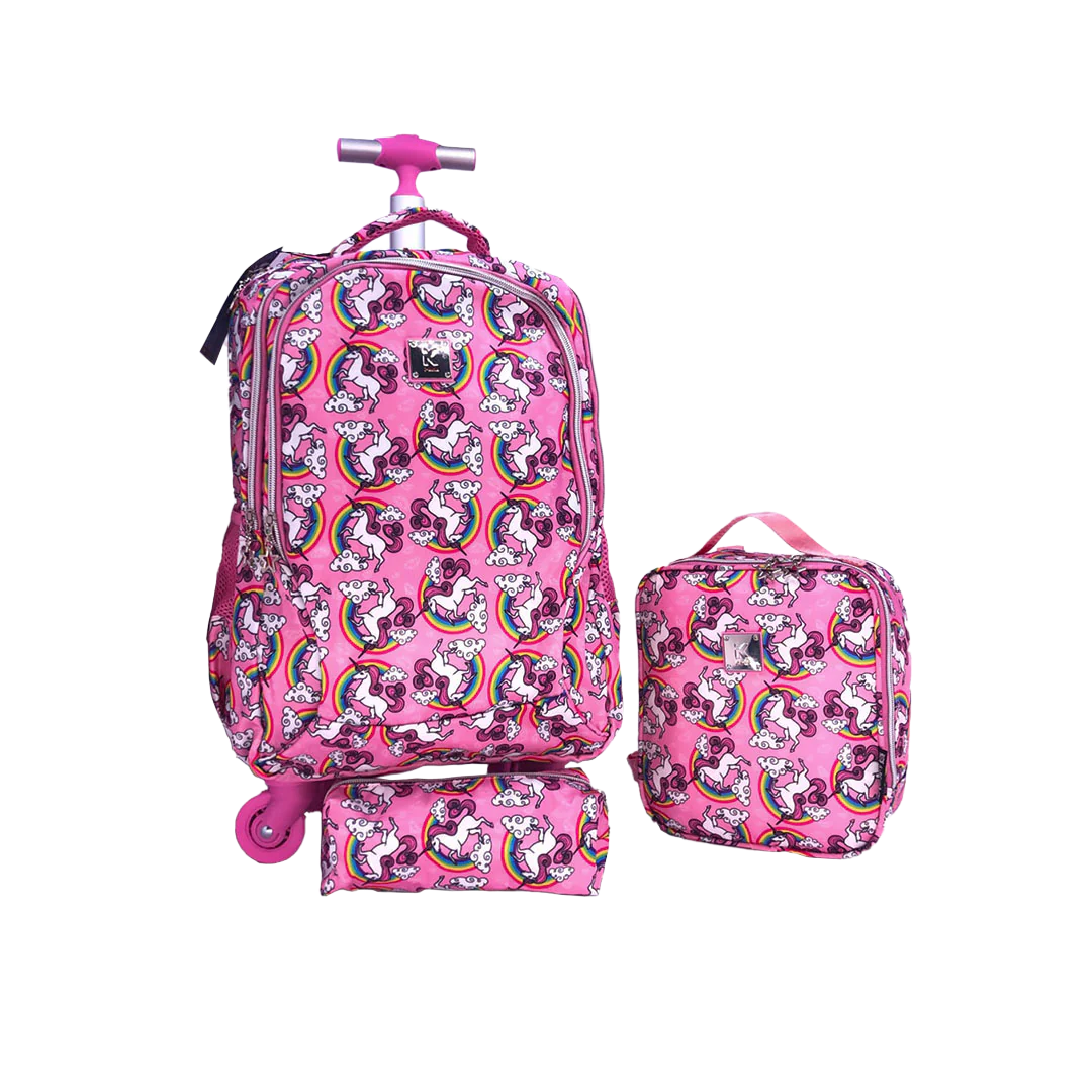 اجعلي المدرسة ساحرة مع طقم حقائب الترولي الوردي الرائع هذا، المكون من ثلاث قطع، والمُصمم بتصاميم يونيكورن وقوس قزح نابضة بالحياة. سواءً للاستخدام اليومي في المدرسة أو أثناء السفر، فإن هذا الطقم المتناسق يجمع بين المرح والعملية. مصنوع من مواد عالية الجودة، مما يضمن المتانة والراحة، مما يجعله الرفيق المثالي للفتيات الصغيرات.