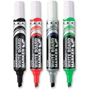 قلم تحديد السبورة البيضاء Pentel Maxiflo MWL6-04 Bullet - تشكيلة متنوعة (عبوة من 4 قطع) يُقدم كتابة نابضة بالحياة وسلسة بفضل حبره الصبغي طويل الأمد. مثالي للفصول الدراسية والمكاتب والعروض التقديمية، حيث يتميز بخطوط واضحة وسهلة القراءة، تُمحى بسهولة من السبورة البيضاء.